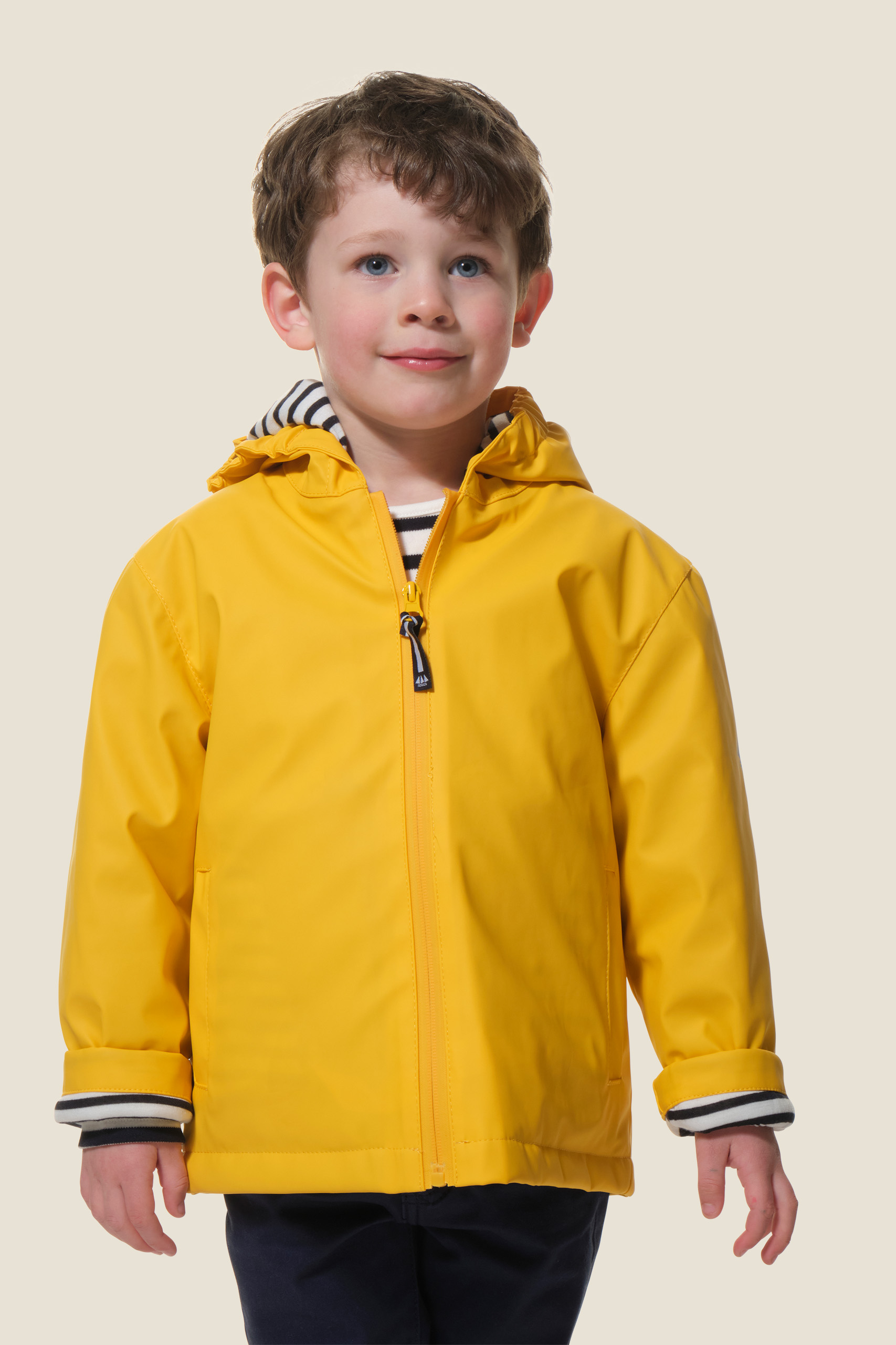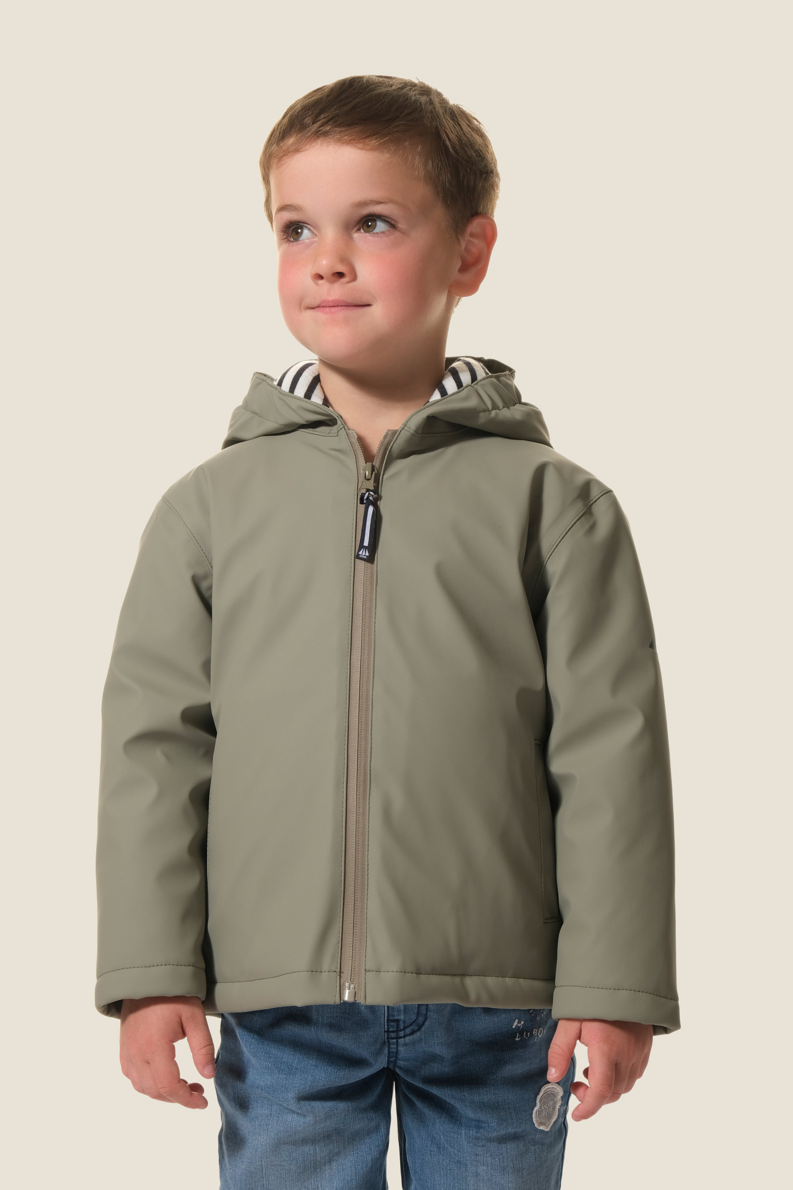 - Ciré avec capuche, doublé jersey rayé et nylon matelassé